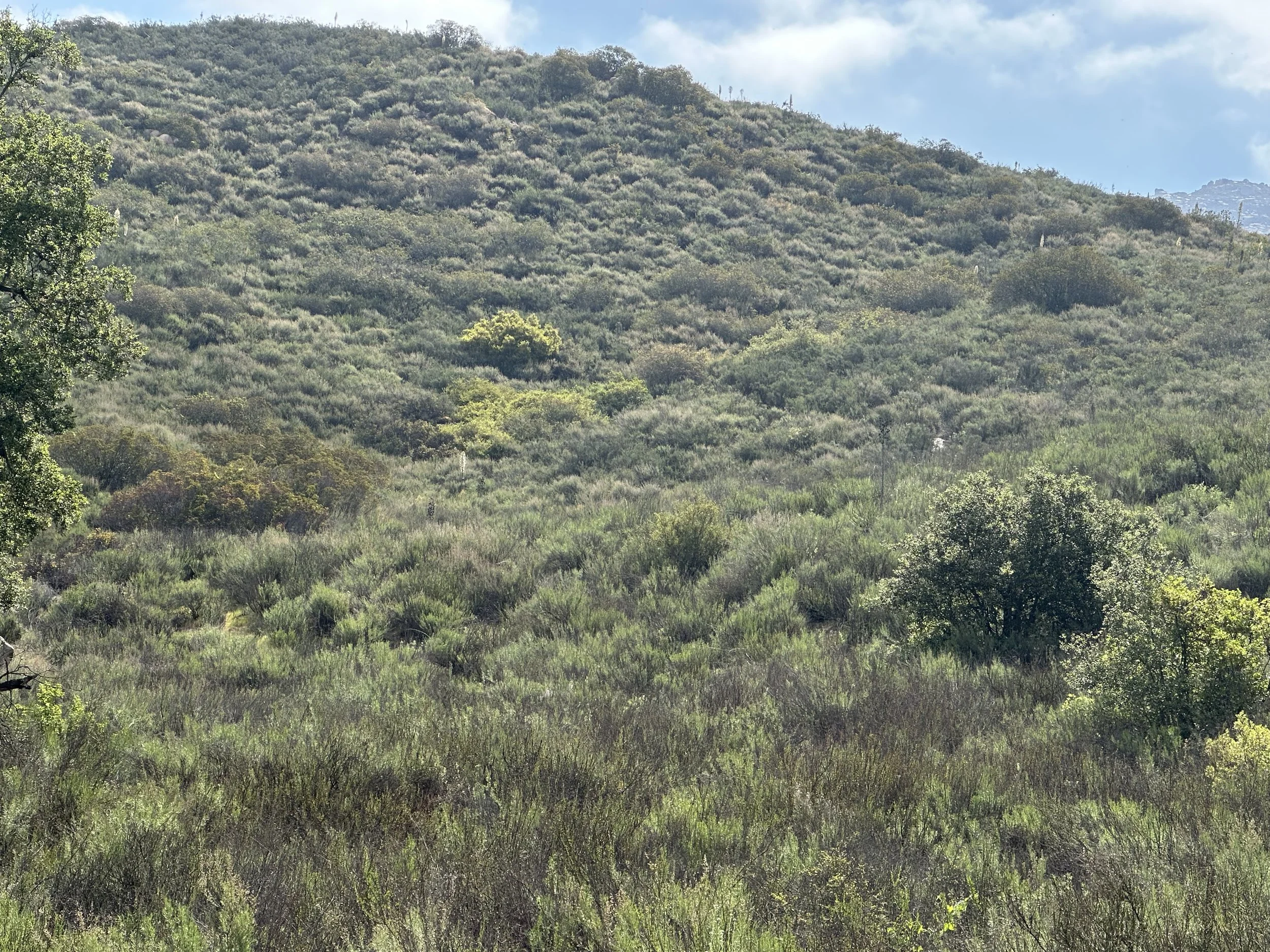 The chaparral habitat is very hard to hike through due to the very dense growth of a variety of woody-stemmed shrubs that can grow up to 13 ft. high. These shrubs are mostly drought tolerant, and often have thick, evergreen leaves. This habitat is adapted to infrequent fire, as many of these shrubs can sprout back from their roots after a fire. Chamise is the dominant species in most chaparral; this habitat is found on 35% of the total property of the reserve.