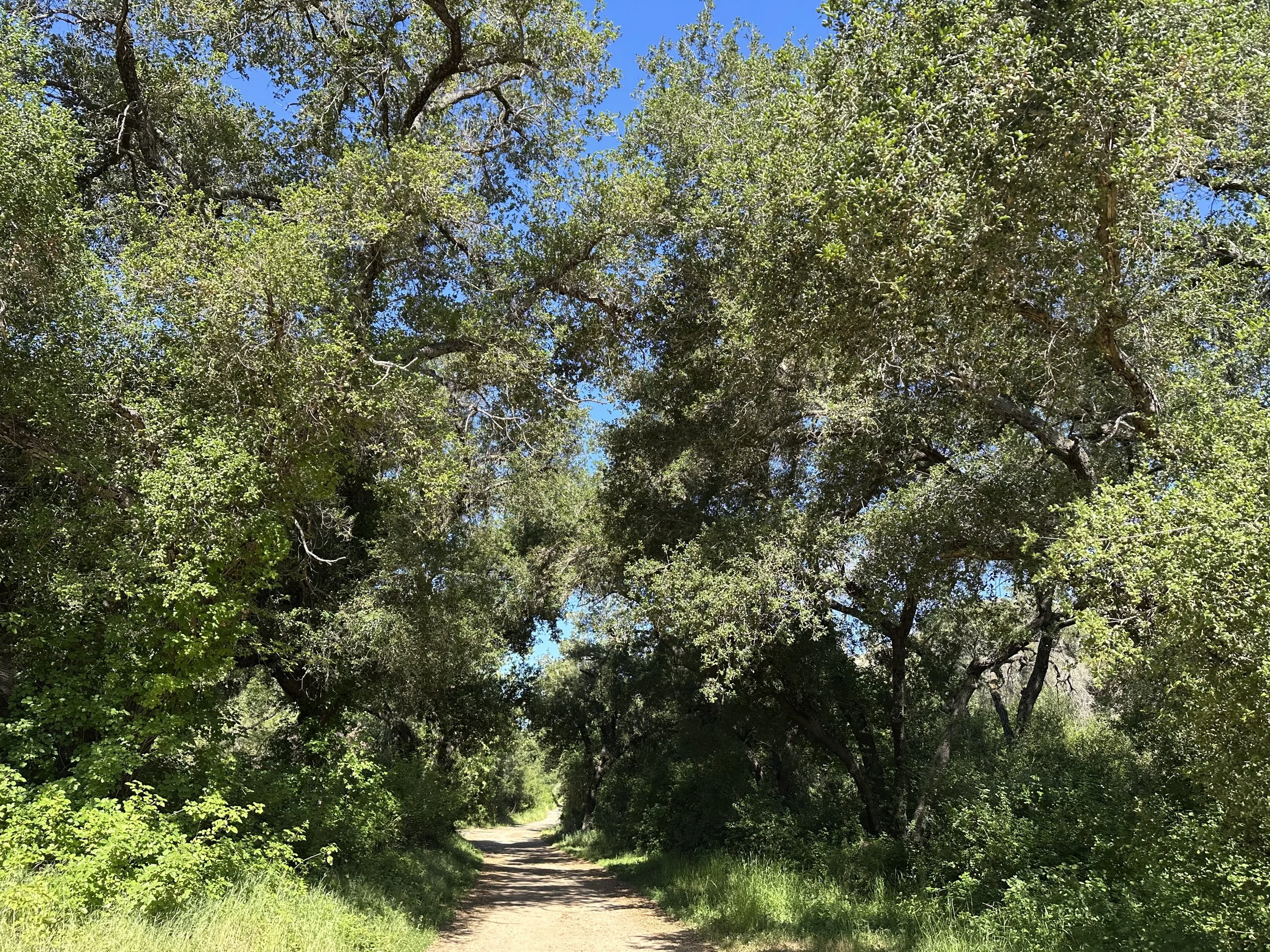 Coast live oak, up to 60 ft. tall, are the primary species in this habitat. A few grasses and shrubs appear in between the trees. In Blue Sky, oak woodland can be found in valleys, which receive water from surrounding slopes and on north-facing sides of hills and canyons, which are more shaded than south facing slopes. These areas are less drought prone and so favor the growth of oaks and grasses rather than the development of dense chaparral shrubs.
